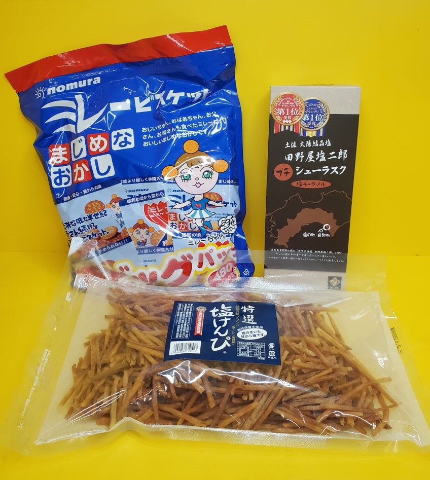 高知のお土産として不動の人気を誇るお菓子「野村のミレービスケット」、「水車亭の塩けんぴ」、「田野屋塩二郎シューラスク」の3点を取り揃えた、ご自宅用はもちろん、ご贈答用にも最適なセットとなります。