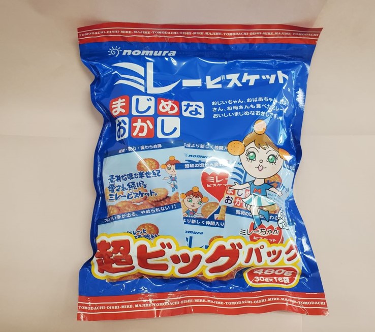 健康で安心、素朴な味で半世紀。 昭和の頃からの味と製法を守り、あらゆる世代に愛され続ける「まじめなおかし」こと「ミレービスケット」を、30gの小分けパックが16袋入っている、総重量480gの超ビッグパックでお届けします。