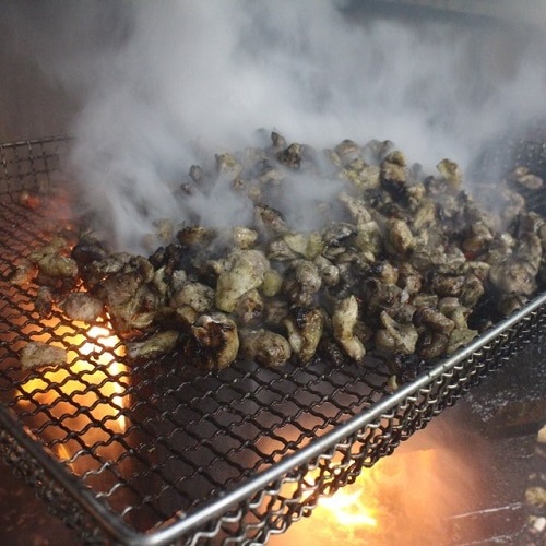 職人が丁寧に、炭火の高い火力で一気に焼き上げることで、鶏の脂が炭火に落ち、立ちのぼる煙で鶏肉が燻されることで黒く色付きます。