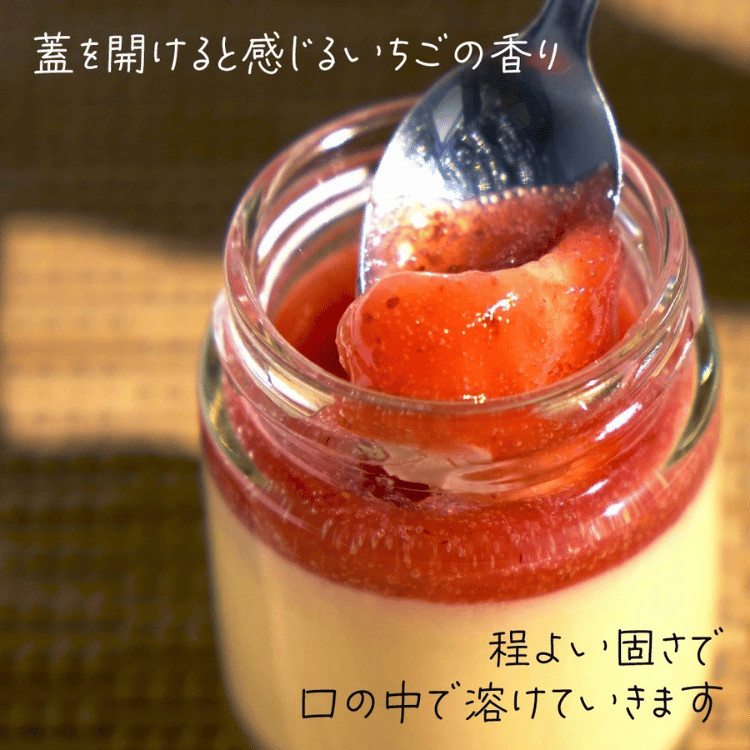 赤く輝く博多あまおうのピューレに、優しいプリンの色が映えて、見た目からも楽しめるスイーツです。